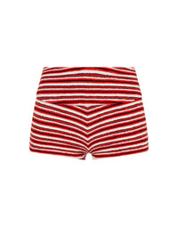 A side-tie bikini in red and white terry stripe. Fully adjustable triangle top and bottoms with self-tie fastenings. Choose from either cheekiest or cheeky bottoms. This bikini also comes with a neoprene zip bag.